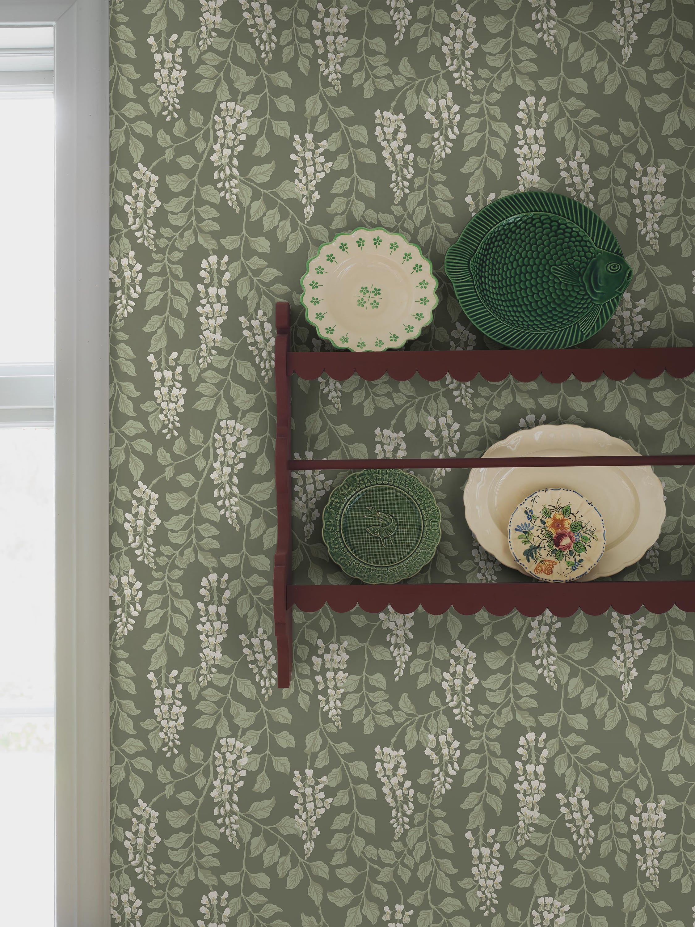 Lassen Sie sich von den träumerischen, warmen Grüntönen und der natürlichen Harmonie und Schönheit unserer Blåregn-Tapete überzeugen. Weiße Glyzinienblüten und... Lesen Sie mehr