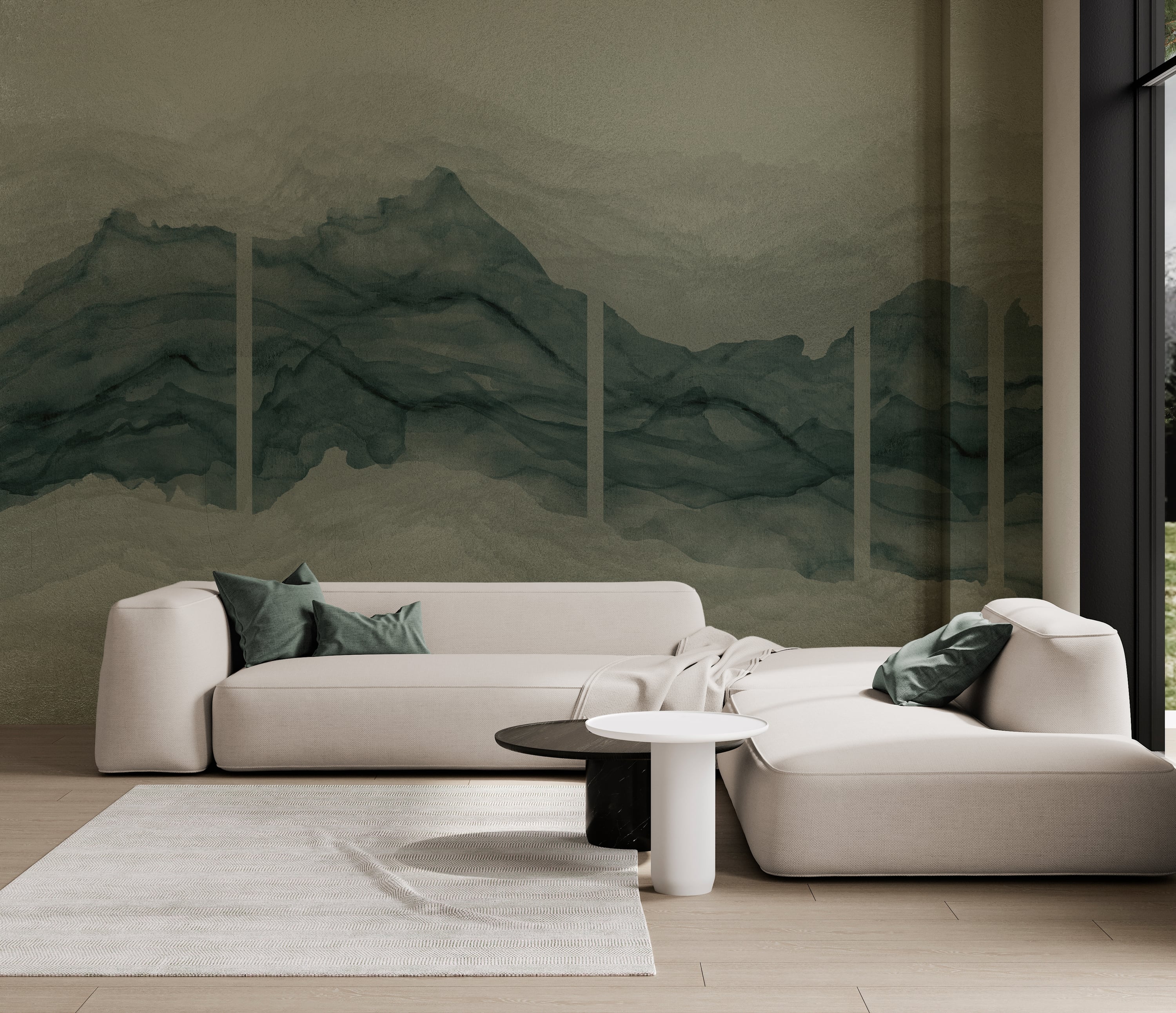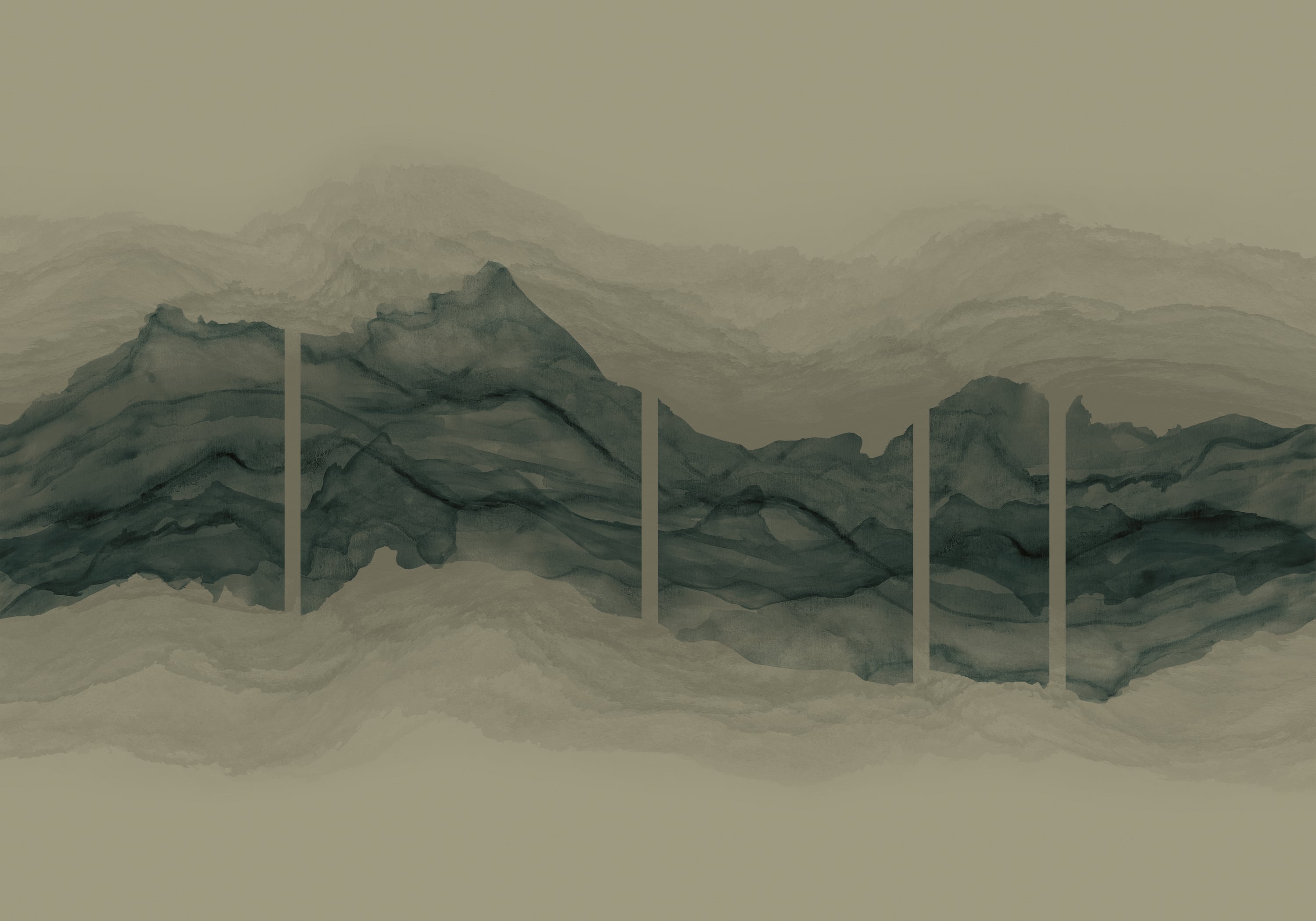 Flüssige Pinselstriche in Aquarell und Tusche. Minimalistischer Panoramablick auf Japanisch beeinflusste Bergketten. Lesen Sie mehr