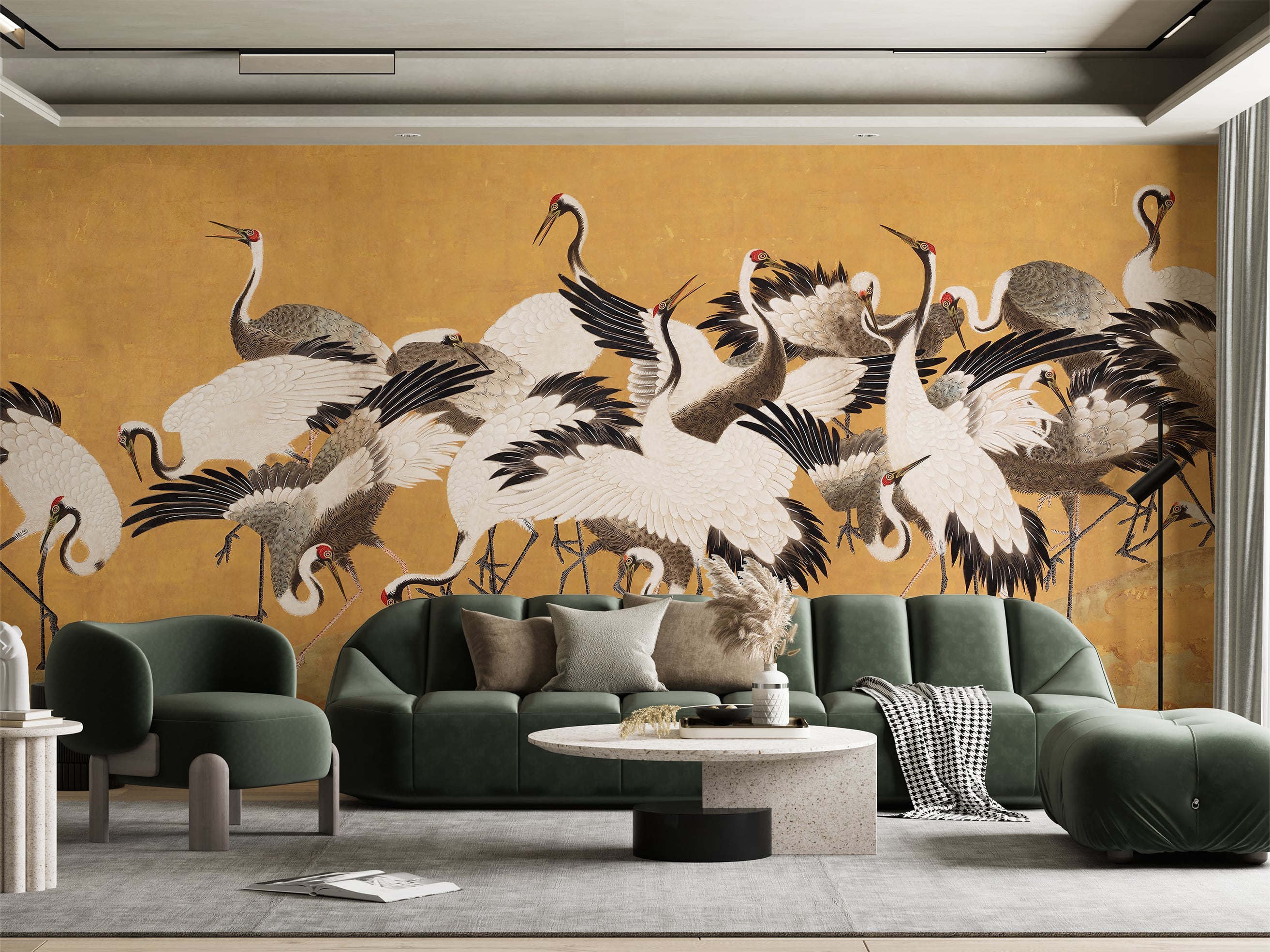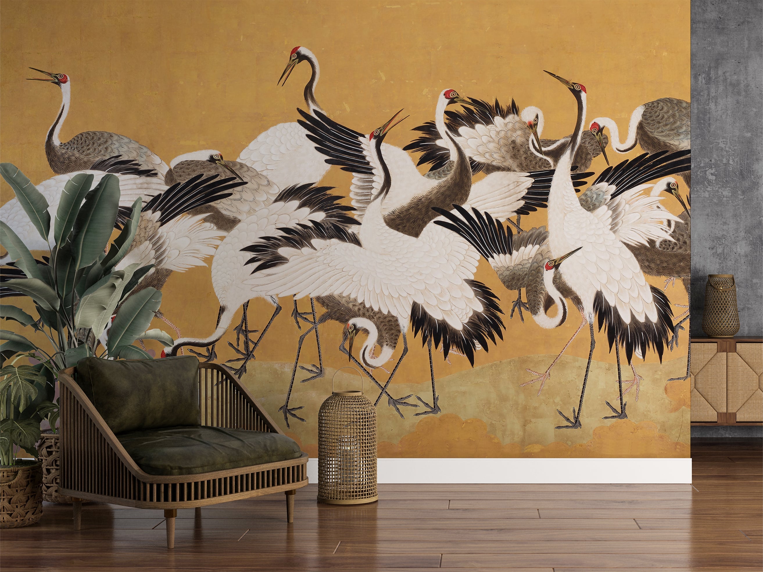 Ein Schwarm von weissen und grauen Kranichen hat sich auf diesem Wandbild niedergelassen und verzaubert vor einem goldenen Hintergrund vielleicht... Lesen Sie mehr