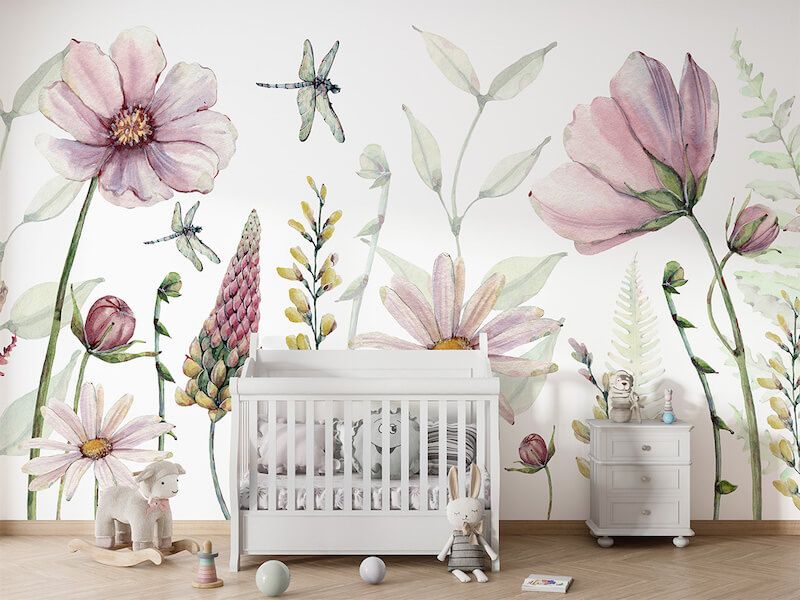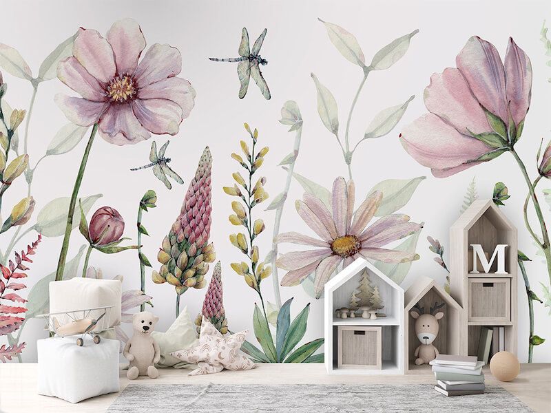 Zarte Rosa- und Gelbtöne werden in diesem floralen Wandbild mit lebendigem Grün kombiniert. Libellen flattern zwischen den üppigen Blüten umher.... Lesen Sie mehr