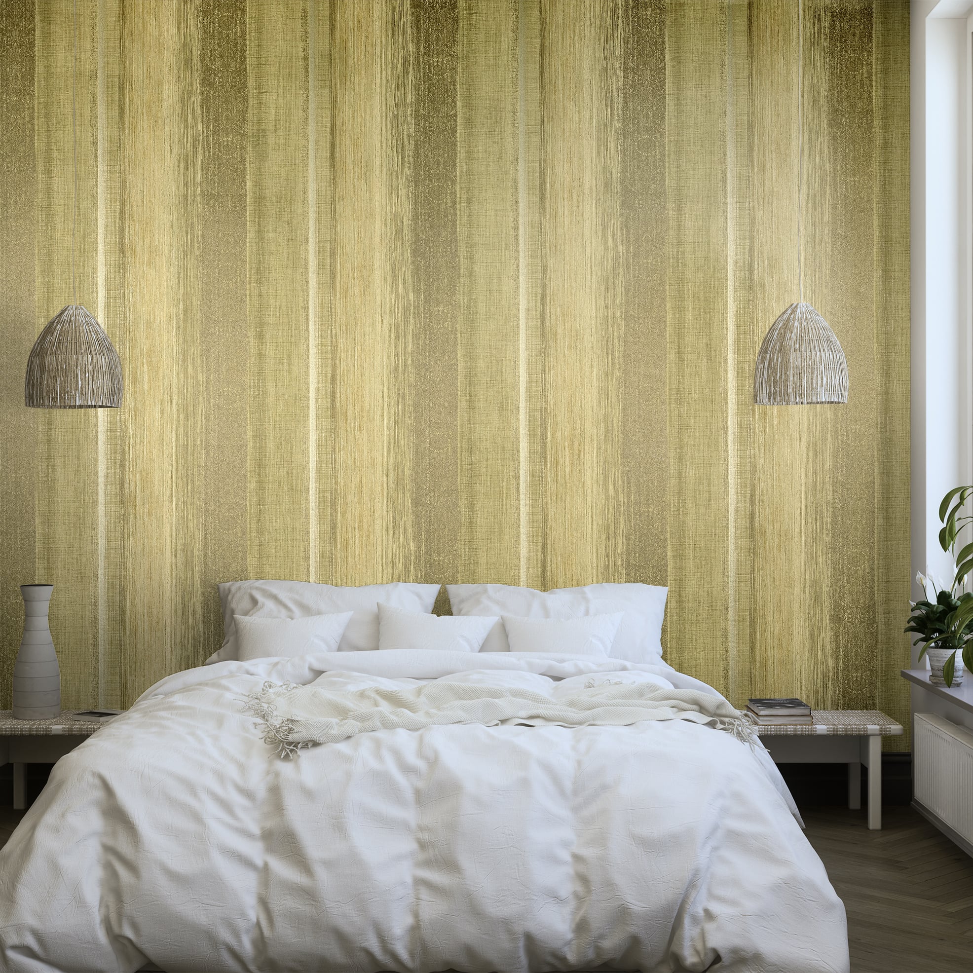 Traditionelle Seidenfasern verleihen Chiffon einen eleganten Schimmer. Dieser Effekt wird durch silber- oder goldschimmernde Streifen auf der wohngesunden Vliestapete nachempfunden.... Lesen Sie mehr
