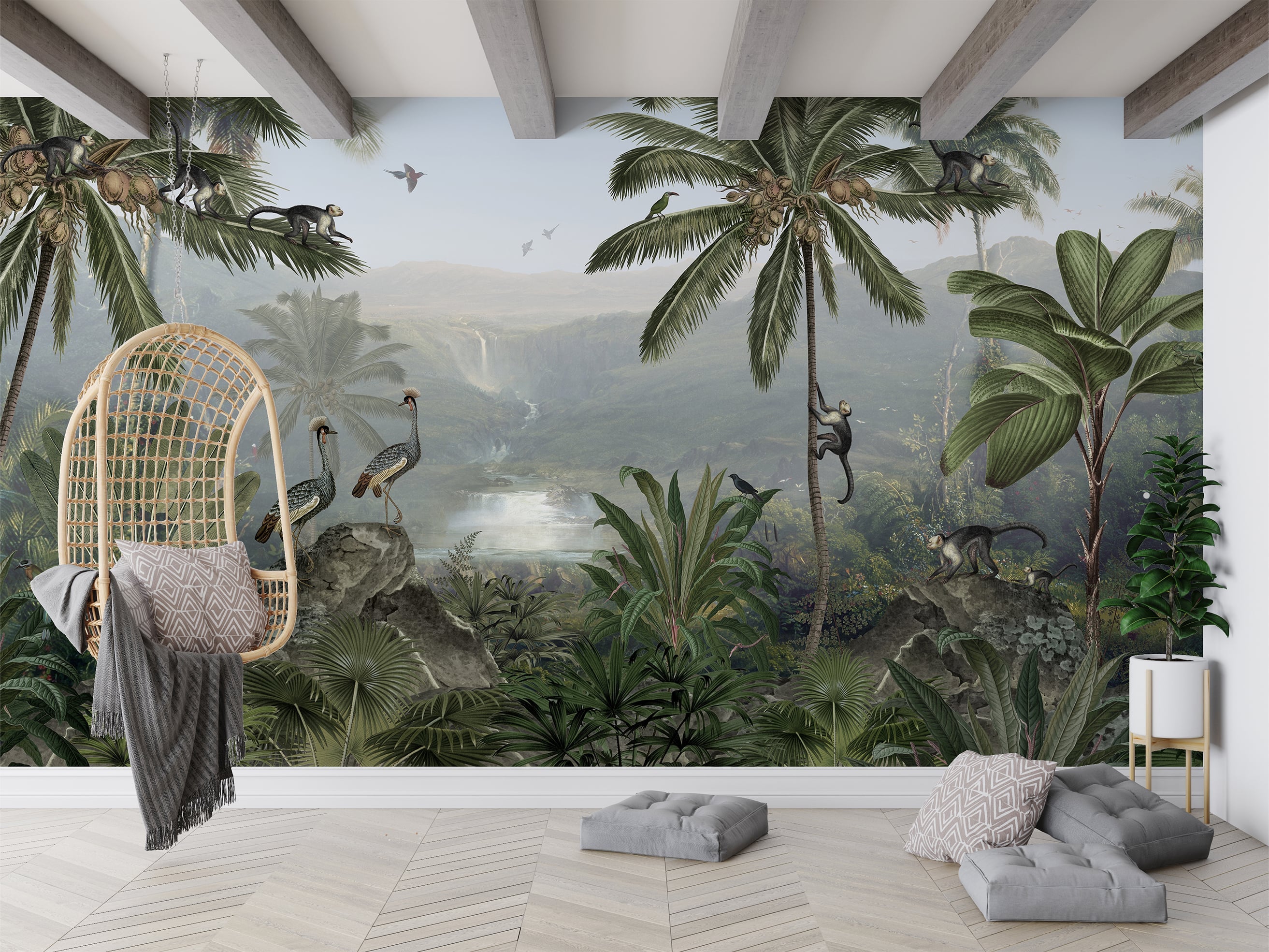 Dieses Wandbild zeigt eine Dschungelszenerie mit einem atemberaubenden Ausblick auf einen grossen Wasserfall in der Ferne mitten im Urwald. Affen... Lesen Sie mehr